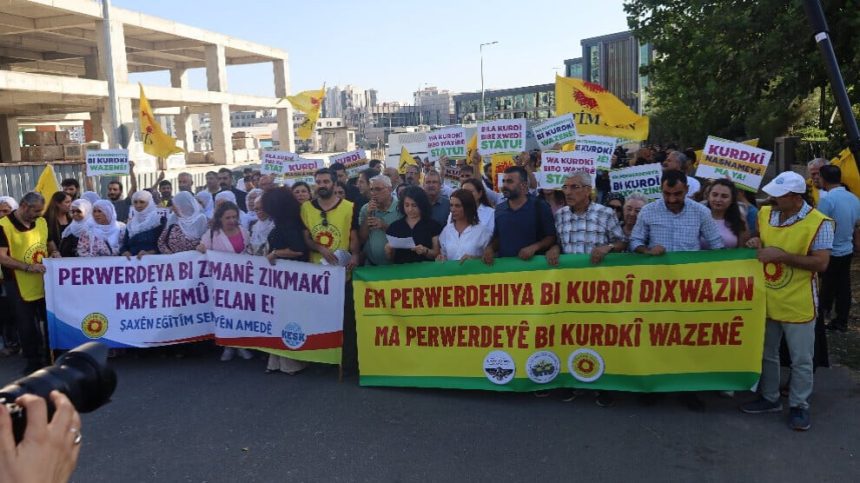 Saziyên Ziman ên Kurdî yên Amedê û Şaxa Hejmar Sendîkaya Kedkarên Zanist û Xizmetên Civakî (Egîtîm-Sen) a Amedê bi boneya destpêkirina serdema nû ya perwerdehiyê bi dirûşma “Perwerdeya bi zimanê dayikê mafê hemû zarokan e” li pêşiya pêşiya avahiyê Gerînendetiya Perwerdeya Mîllî ya Amedê daxuyanî dan.