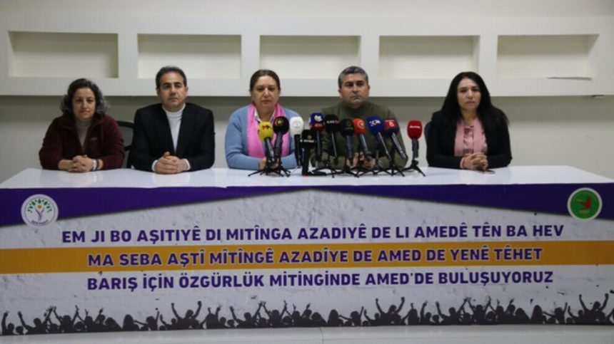 Tevgera Jinen Azad (TJA), Partiya Herêman a Demokratîk (DBP) û Partiya Demokrasî û Wekheviyê ya Gelan (DEM Partî) beriya banga dîrokî ya Rêberê Apo ku wê piştî hevdîtina şandeyê were kirin, li avahiya Rêxistina DEM Partiyê ya Amedê daxuyanî dan. Hevserokê DBP’ê yê Amedê Mehmet Şîrîn Gurbuz di daxuyaniyê de bal kişand ser daxuyaniya ku tê payin bê dayin û wiha got: “Ji bo piştevaniya bi vê daxuyaniya dîrokî re em bang dikin; em gotinên birêz Ocalan esas digirin. Lewma jî daxuyaniya ku dê îro were dayin ji bo me gelek watedar û erênî ye. Me îro careke din dît ku tecrîd vala hatiye derxistin. Bêguman dê daxuyanî bê dayin û peyamên birêz Ocalan dê bigihijin gelên cîhanê. Em wê îradeya ku di hemû şert û mercan de li cem aştî û pêkvejiyanê cih girt û pêşniyarên xwe li ser vê bingehê kir û heta dawiyê ji muzakereyan paşvegav neavêt, silav dikin.”