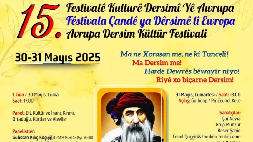 Federasyona Elewiyan a Demokratîk (FEDA), Federasyona Yekîtiyên Dersimê yên Demokratîk li Ewropayê (ADEF) û Kongreya Avakirinê ya Dersimê (DÎK) Festîvala Çandê ya Dersimê ya 15’emîn a li Ewropayê di navbera 30-31’ê Gulana 2025’an de li Rebstockpark a Frankfurtê lidar dixin.