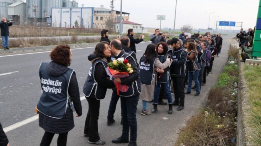 Hevserokên DBP’ê Çîgdem Kiliçgun Ûçar û Keskîn Bayindir ku di baskên cuda yên meşê de bûn, bi navê koma xwe kulîlk dan hev.