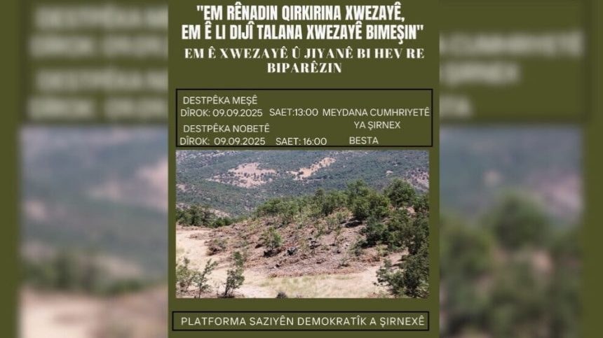 Bi pêşengiya Platforma Saziyên Demokratîk, bi dirûşmeya “Em rê nadin qirkirina ekolojiyê, em li dijî talankirina xwezayê dimeşin” dê du rojan çalakî bên lidarxistin. Aktivîstên ekolojiyê, niştecihên herêmê û parêzvanên jîngehê dê di 9’ê Îlonê de li Qada Cumhuriyetê ya navenda bajarê Şirnexê berî meşê li dijî talankirinê daxuyaniyekê bidin. Hevseroka Giştî ya Partiya Wekhevî û Demokrasiyê ya Gelan (DEM Partî) Tulay Hatîmogûllari, Hevserokê Giştî yê Partiya Herêmên Demokratîk (DBP) Keskin Bayindir û gelek parlamenterên DEM Partiyê dê beşdarî çalakiya nobeda şevê bibin.