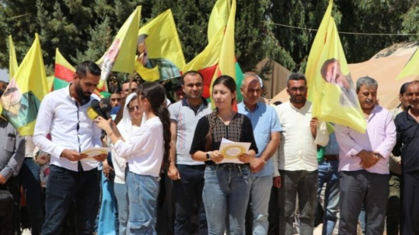 Endama Desteya Perwerdeyê ya Meclisa Kampa Serdem Gulistan Mistefa û endamê Desteya Perwerde û Fêrkirinê ya kantona Efrîn û Şehbayê Zuhêr Helebî daxuyanî li pêşiya navenda Meclisa Kantona Efrîn û Şehbayê ya li Kampa Serdem a bajarokê Ehdasê xwend.
