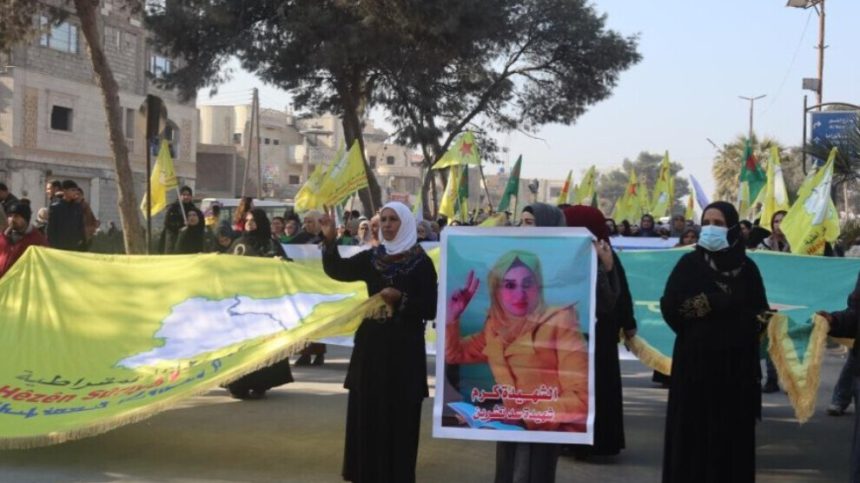 Bi sedan şêniyên kantona Reqayê, endamên Kombûna Jinan a Zenûbiya, Partiya Sûriyeya Pêşerojê û nûnerên Rêveberiya Xweser a Herêma Bakur û Rojhilatê Sûriyeyê bi armanca silavkirina berxwedana li Bendava Tişrînê û piştgiriya QSDˈê meşek li dar xist.
