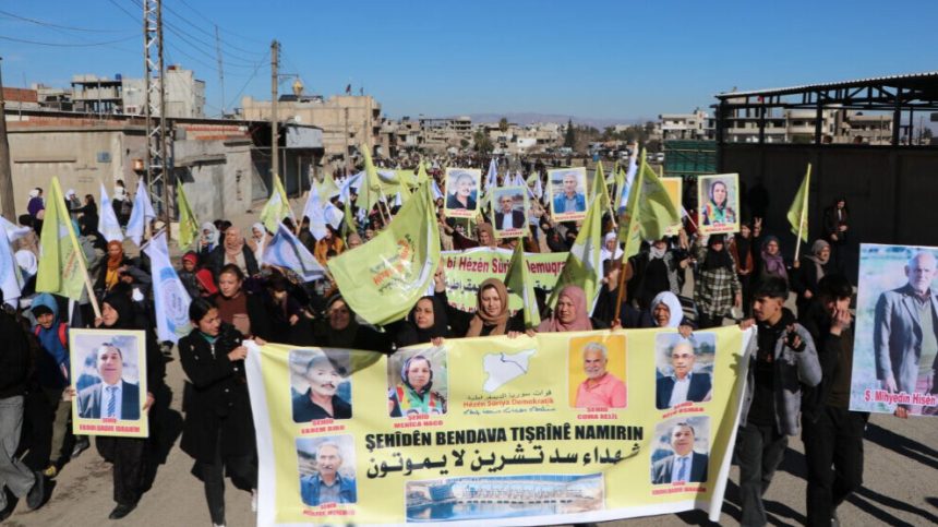 Di meşê de beşdaran alên Hêzên Sûriyeya Demokratîk (QSD) hilgirtin.