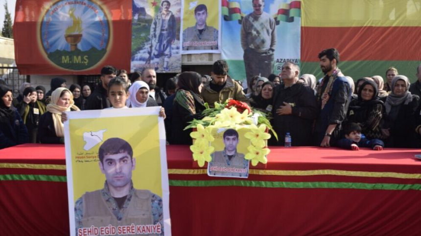 Bi sedan şêniyên bajarên Dêrik, Girkê Legê û Çilaxa yên kantona Cizîrê, ji bo veşartina cenazeyê şervanê Hêzên Sûriyeya Demokratîk Egîd Serêkaniyê (Mihemed Ehmed) ku di 26ê Kanûnê de li Qerqozaqê şehîd bibû, berê xwe dan goristana şehîd Xebat Dêrik.