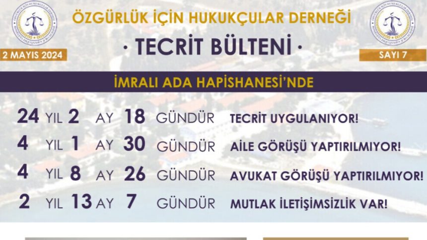 Di bultenê de hate destnîşankirin ku li Îmraliyê 24 sal û 2 meh û 18 roj in tecrîdek heye, 4 sal sal û mehek û 30 roj in malbat nikarin hevdîtinê bikin, 4 sal û 8 meh û 26 roj in parêzer nikarin hevdîtinê bikin û bal hate kişandin ku 2 sal û 3 meh û 7 roj in jî pêkanîna “agahînegirtina mutleq” heye.