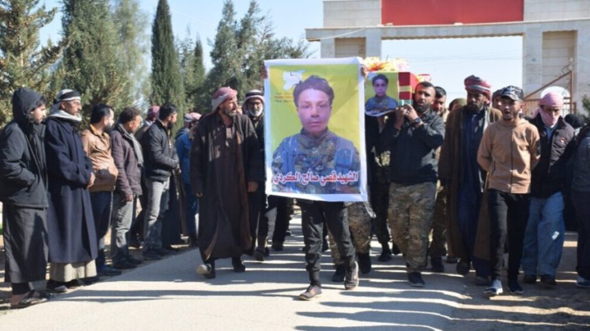 Şêniyên navçeyê li Goristana Şehîdan kom bûn û cenazeyê şervanê Hêzên Sûriya Demokratîk (QSD) Qusey Salih El Kirdî ku di Sibatê de şehîd bûbû, spart axê.