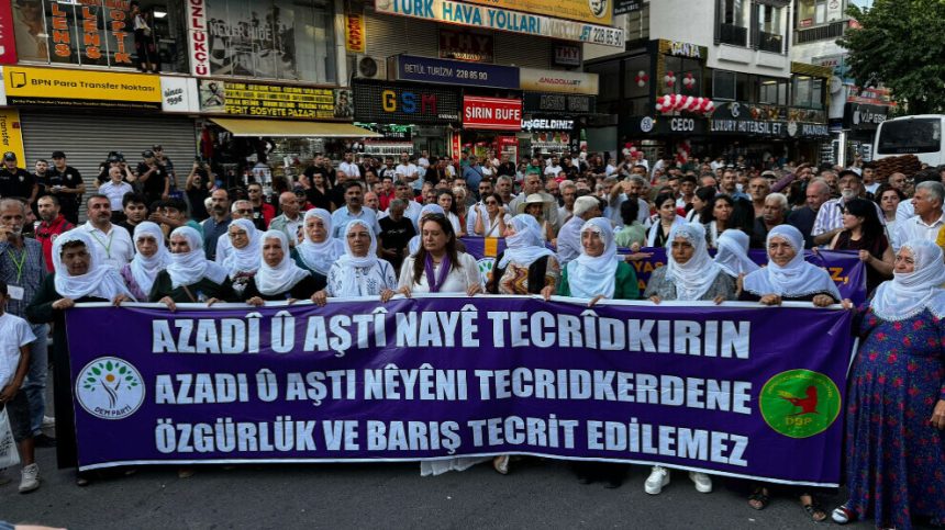 Di meşa ku Dayikên Aştiyê bi laçikên xwe yên spî beşdar bûn de, sekînina girseyî ya demekî dirêj a ji aliyê polîsan ve bi çepikan hate protestokirin. Piştî muzakereyên hatin kirin Dayikên Aştiyê yên bi laçikên xwe yên spî li herî pêş bûn bi pankarta ku Kurdî û Tirkî li ser “Azadî û aştî nikare were tecrîdkirin” dest bi meşê kirin. Tevgera Jinên Azad (TJA) bi pankarta “Jin di aştiyê de bi israr in” meşiyan.