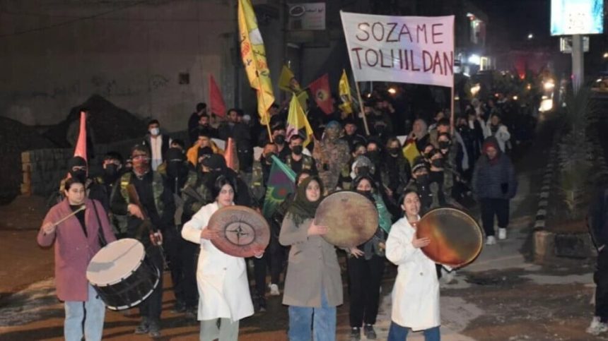 Li bajarê Dirbêsiyê yê Kantona Cizîrê, êriş û komkujiyên komên çete yên hikumeta veguhêz a Şamê yên li dijî sivîlên li taxên Şêxmeqsûd û Eşrefiyê yên Helebê bi meşekê hatin şermezarkirin.