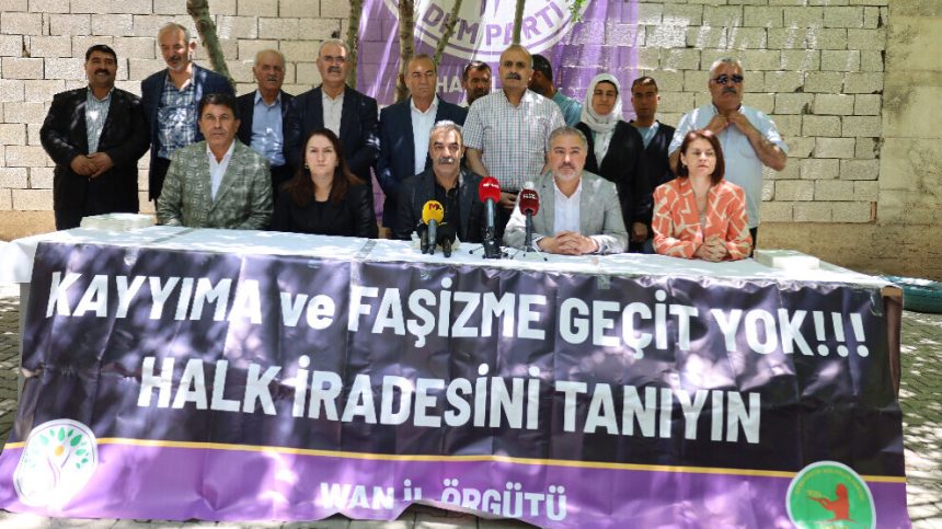Di daxuyaniyê de pankarta “Em rê nedin qeyûm û faşîzmê, îradeya gel nas bikin” hate hilgirtin. Hevserokê DBP’ê yê Wanê Harun Okay banga tevlibûna mitînga li Colemêrgê li her kesî kir. Okay, wiha got: “Qeyûm, zilm û talan e. Li dijî zîhniyeta gelê kurd tune dihesibîne, em ê çalakiyên xwe bidomînin. Bi vê wesîleyê em banga tevlibûna mitînga mezin a li Colemêrgê li tevahiya gelê xwe dikin. Em ê li Bulwara Çohaz Petrolê bên gel hev û otobûsên me wê ji wir ber bi Colemêrgê ve bikevin rê. Em tevahiya gelê xwe vedixwînin.”