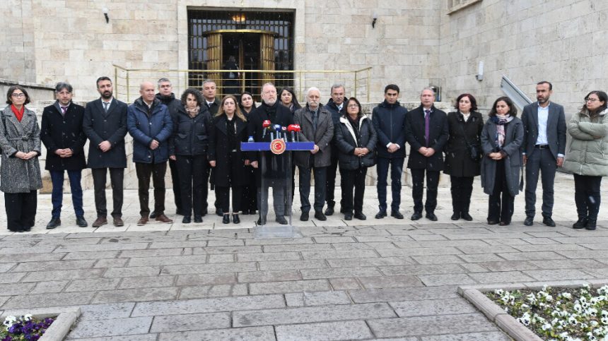 Serokwekîlê Koma Partiya Wekhevî û Demokrasiyê ya Gelan (DEM Partî) Sezaî Temellî û parlamenteran, li dijî bêdengiya Serokê Meclisê Nûman Kurtulmuş a li dijî tayînkirina qeyûman, li Deriyê Çapemeniyê yê Meclisê daxuyanî dan.