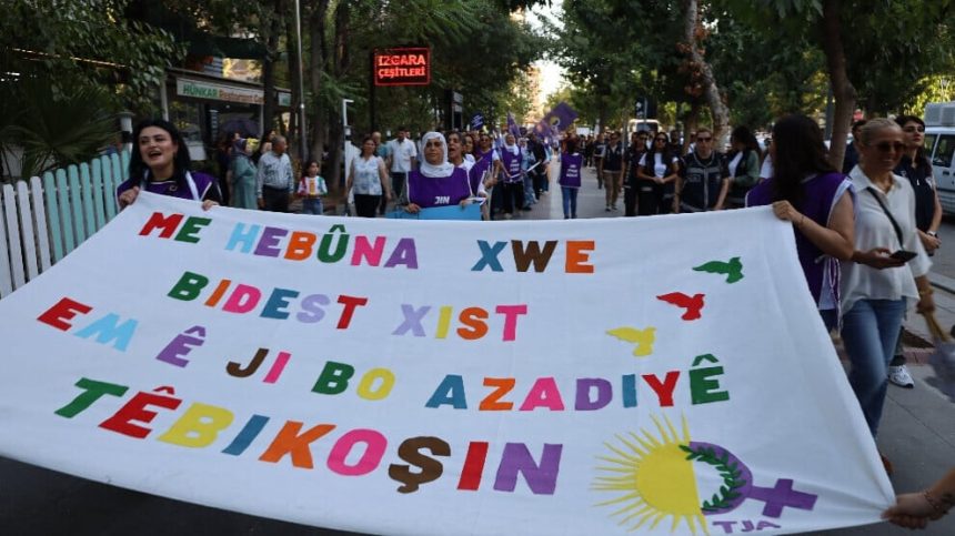 Jinên ku bi pêşengiya TJA’yê li pêşiya avahiya DEM Partiyê ya bajêr li hev civiyan, heta Parka Yilmaz Guney bi çêkirina “Zincîra Aştiyê” meşiyan. Di meşê de pankarta “Me hebûna xwe bi dest xist, ji bo azadiya xwe têdikoşin” hate vekirin û dirûşmeyên “Ji şer re na, tavile aştî”, “Jin, Jiyan, Azadî” hate berzkirin.