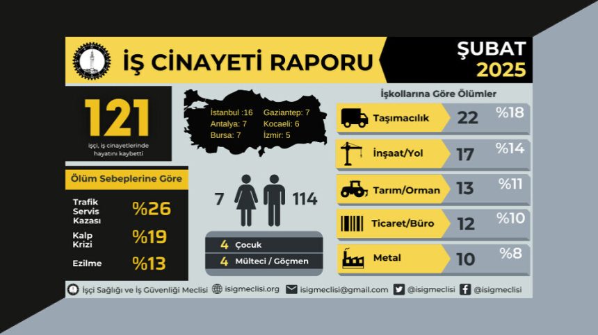 Li gorî rapora Meclîsa Tenduristî û Ewlekariya Kar (ÎSÎG) ya Sibata 2025’an, di encama qezayên kar de 121 karkeran jiyana xwe ji dest dan. Di nava karkerên jiyana xwe ji dest dane 4 zarok û 4 koçber jî hene.