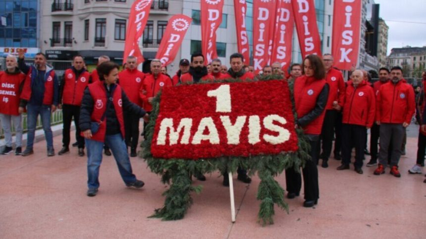 Heyeta DÎSK’ê ku Seroka Giştî Arzu Çerkezoglû jî di nav de bû, hate pêşiya Konsolosxaneya Alman a li Taksîmê. Şandeya DÎSK’ê, ji vir bi dirûşm û çepikan ber bi Qada Taksîmê ve meşiya. Şandeya DÎSK’ê, dirûşmên “Bijî 1’ê Gulanê”, “Bi tena serê xwe rizgarî tune ye yan bi hev re yan tu kes ji me” û “Qeyûm wê biçin em ê bimînin” berz kirin û çeleng danîn ber bîrdariyê.