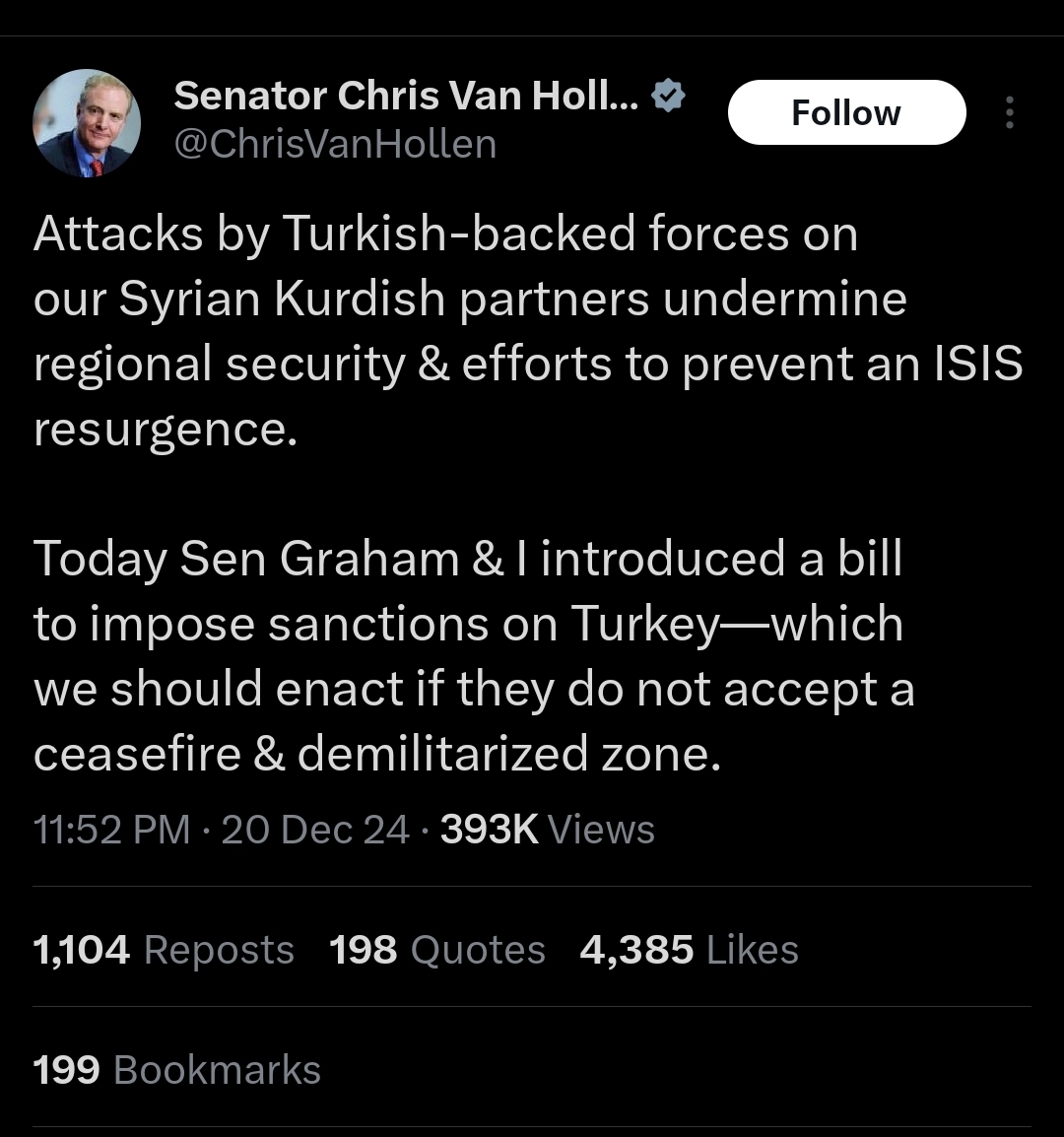 Graham û Van Hollen, dan xuyakirin ku ev pêşnûmeya ku wan pêşkêş kiriye bi armanca pêşîgirtina êrîşên li dijî Hêzên Sûriyeya Demokratîk ji aliyê Tirkiyeyê an jî komên ku Tirkiye piştgiriya wan dike.
