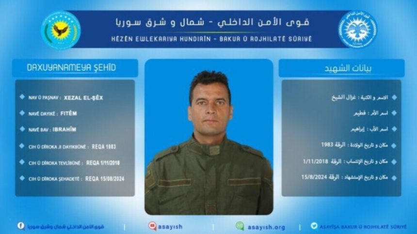 Di daxuyaniyê de hate ragihandin ku endamê Hêzên Ewlekariya Hundirîn Xezal El Şêx dema erka xwe pêk dianî, ji ber nexweşiyeke giran şehîd bûye. Di daxuyaniyê de hate gotin, Xezal El Şêx roja pêncşemê (15’ê Tebaxê) li Reqayê şehîd bûye.