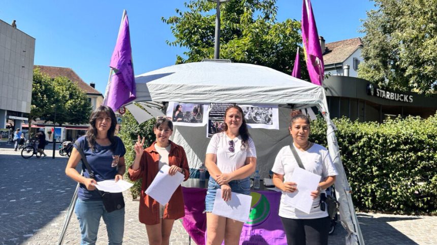 Tevgera Jinên Kurd a Swîsreyê (YJK-S) bi armanca xwedîderketina li jinên Efganistan, Îran û Şengalê li navenda kantona Aarauyê stand vekir. Endamên Navenda Civaka Kurd a Aarauyê jî piştgirî dan çalakiyê. Jinan belavok belav kirin, têkildarî zehmetiyên jinan agahî dan welatiyan û banga hevgirtinê kirin.