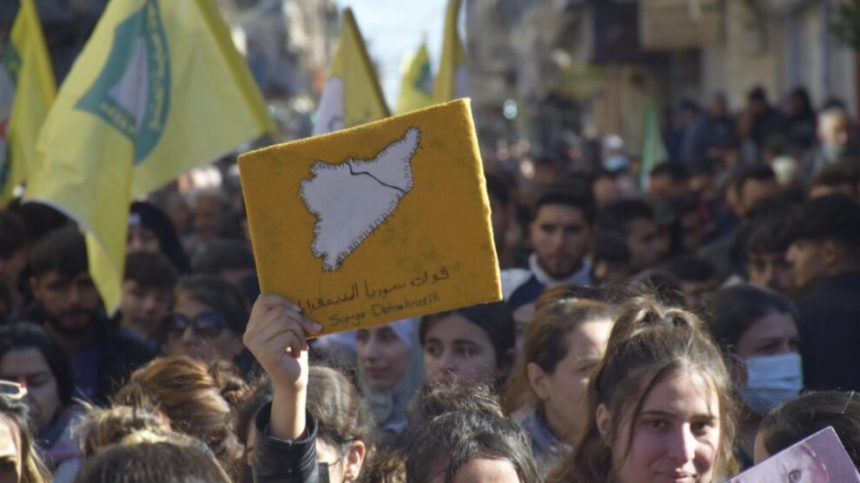Xwepêşandan ji Qada Jina Azad ber bi xaçerêka Gardînya ve bi rê ket. Beşdaran dirûşmên, “Bijî Berxwedana Hêzên Sûriyeya Demokratîk” û “Berxwedan jiyan e” berz kirin. Her wiha alên Hêzên Sûriyeya Demokratîk (QSD), Yekîneyên Parastina Jin (YPJ) û Hêzên Parastina Civakê hildan.
