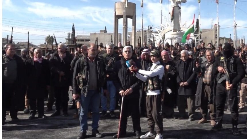 Endamê eşîrê Ebdulkerîm bi zimanê kurdî û Mezher Şêxo bi zimanê erebî li Qada Jina Azad a Amûdê bi amadebûna şênî û rûspiyên eşîrê tevî hildana çekên xwe, daxuyanî xwend.