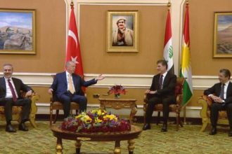 Serokkomarê Tirk Erdogan piştî serdana Bexdayê derbasî Hewlêrê bû û bi Mesrûr û Nêçirvan Barzanî re rûnişt.