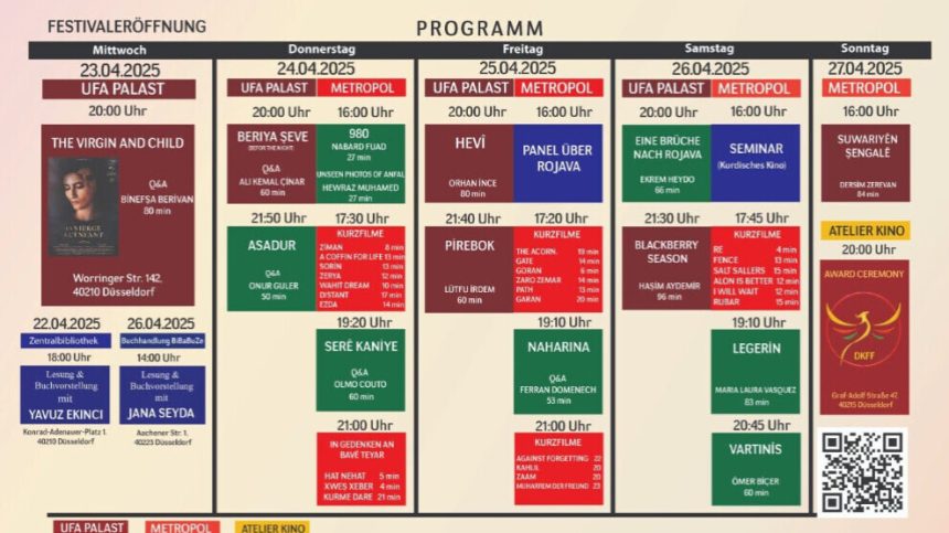 Destpêka festîvalê wê 23’ê Nîsanê roja Çarşemê li sînemay UFA Palastê (Worringer Str. 142, 40210 Dusseldorf) pêk were. Fîlm wê li UFA Palast û Sînemeya Petropol (Brunnenstr. 20, 40223 Dusseldorf) bê lidarxistin.