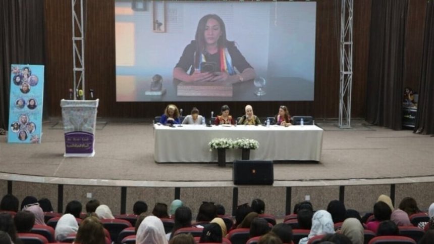 Endama Desteya Serokatiyê ya Partiya Yekitiya Demokratîk (PYD) Foza Yûsiv di konferansa “Hevgirtina jinan bingeha avakirina edalet û demokrasiyê ye li Sûriyeya nenavendî û yekgirtî” de ku li Hesekê tê lidarxistin, axivî.