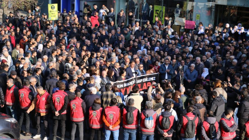Piştî qeyûm li Şaredariya Bajarê Mezin a Mêrdînê, Şaredariya Êlihê û Şaredariya Xelfetiyê ya Rihayê hatin kirin, bi hezaran kes li Amedê hatin gel hev û çalakî li dar xistin. Kesên li ser banga DEM Partî, DBP û TJA’yê hatin pêşiya Plazaya AZC ya li Semta Ofîsê, pankarta “Vîna gel nayê xespkirin em ê rê nedin qeyûman” hilgirtin.