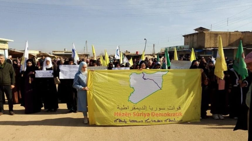 Li dijî êrîşên ser taxên Helebê, koçberên Efrîn-Şehba, bi hezaran xelkê Dêrikê xwepêşandanek ji Qada Jinê ber bi kolana Kornîş ve li dar xist.
