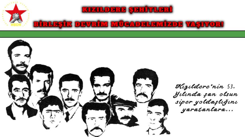 Li Gundê Kizildere yê girêdayî Tokat/Nîksarê 30’ê Adara 1972’yan ji kadroyên pêşeng ên Tevgera Şoreşgeriyê ya Tirkiyeyê Mahîr Çayan û 10 şoreşger di mala ku ji aliyê hêzên dewleta faşîst ve hatî dorpêçkirin de, berxwedaneke mezin raber kirin û bûn nemir. Li Kizildere qetilkirina 10 şoreşgeran, piştî darbeya faşîst a 1972’yan dewama êrîşên stratejîk a tasfiyekirina tevgera şoreşgerî ya Tirkiyeyê ye. Li dijî îdamkirina Denîzan bi pêşengiya Mahîr Çayan 8 kadro û şervanên THKP-C û 2 yên THKO li Kizildere berxwedan hate raberkirin. Ev berxwedan û çalakî li dijî êrîşa tasfiyeyê, bersiva şoreşgeriyê ye. Em vê berxwedanê car din silav dikin. Em ê xwedî li fedekariya têkoşîna Şoreşa Yekbûyî ya 10 hevrêyên xwe derbikevin û soza xwe ya ji bo bîranîna wan, bilind dikin.