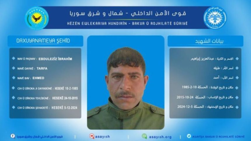 Fermandariya Giştî ya Hêzên Ewlekariya Hundirîn a Herêma Bakur û Rojhilatê Sûriyeyê bi daxuyaniyekê ragihand ku endamekî wan gihişt asta şehadetê.