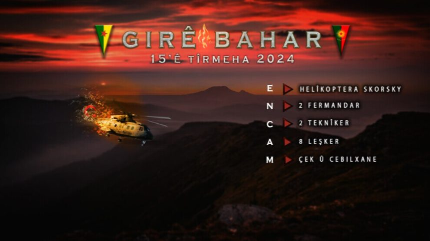 HPG’ê got: “Gerîlayên Azadiya Kurdistanê bi ruhê fedayî yê Apoyî berxwedana xwe ya dîrokî mezin dike û vê berxwedanê vediguherîne çalkaiyên afirîner û dewlemend. Bi vî rengî derbeyên giran li dagirkeran dixe. Hêzên me bi rêbazên encamgir teknîka şer a artêşa Tirk a dagirker hedef digire. Hêzên me şeva 16’ê Tîrmehê li Zapê li helîkoptereke bi tîpa Skorsky a ayîdê artêşa dagirker xist. Helîkoptera ku dixwest li qadê bi cih bibe, kete xwarê û îmha bû. 12 dagirkerên di hundirê helîkopterê de birîndar bûn. Tevî ku serbazê bi navê Mustafa û 2 pîlotên di rutbeya tegmen de, 2 teknîsyen, efserek û 7 leşkerên dagirker ên di hundirê helîkopterê de birîndar bûne, artêşa Tirk a dagirker hewl da vê çalakiya mezin a gerîla veşêre.”
