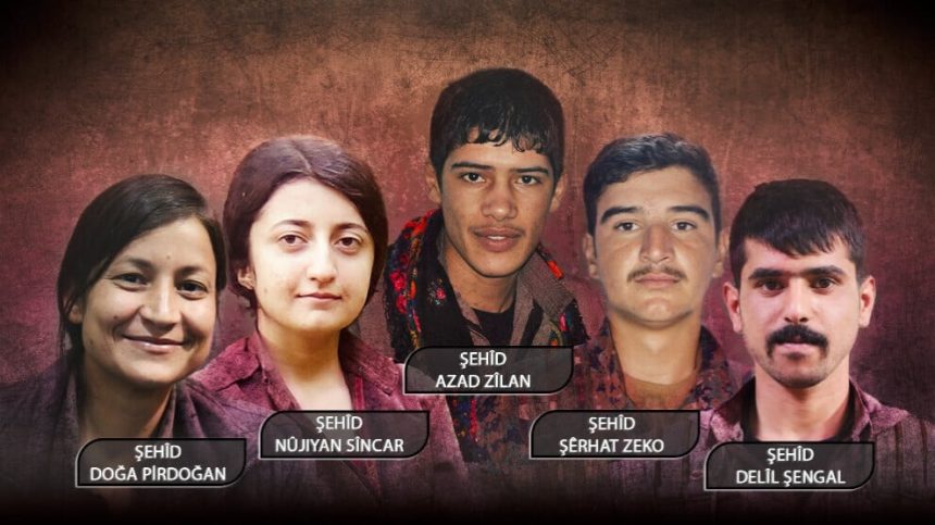 Em dubare hevrêyên xwe Doga, Delîl, Nûjiyan, Azad û Şêrhat ku ev heqîqet bi kedeke mezin û dayîna canê xwe nîşan dan, bi rêzdarî, hezkirin û minetdarî bi bîr tînin. Girêdayî vê yekê di serî de malbatên wan ên hêja sersaxiyê ji gelên me yên Êzidî û Ereb ên li Şengalê dixwazin. Em soza xwe ya meşa li ser şopa şehîdên xwe û pêkanîna armancên wan nû dikin û diyar dikin ku em ê bîranên wan di xwişk-biratiya gelan de tim û tim zindî bigirin.