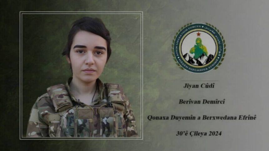 “Em hevrêya xwe Jiyan Cûdî bi navê xwe yê rast Bêrîvan Demîrcî ku di 30’ê Çileya 2024’an li herêma Efrînê tevî çar hevrêyên xwe gihişt asta şehadetê bi hurmet û rêzdarî bi bîr tînin, di serî de ji bo malbata hêja ya Demîrcî em sersaxiyê ji tevahî gelê xwe re dixwazin û di şexsê hevrê Jiyan de em soza xwe ya şopandina rêya şehîdan dubare dikin.