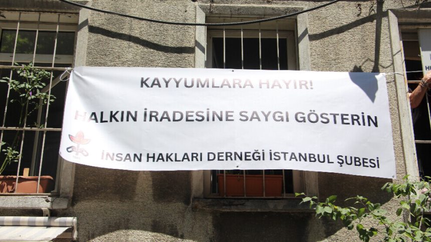 Şaxa Komeleya Mafên Mirovan (ÎHD) a Stenbolê bi armanca tayînkirina qeyûm a ser Şaredariya Colemêrgê protesto bike li avahiyê xwe ve pankarta “Ji qeyûman re na, ji îradeya gel re rêzdar bin” daliqand.