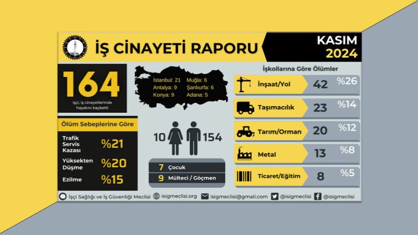 Meclisa Tenduristiya Karkeran û Ewlehiya Kar (ÎSÎG) rapora xwe ya têkildarî cînayetên kar ên meha Mijdarê eşkere kir. Li gorî raporê di meha Mijdarê de herî kêm 164 û di deh mehên salê de jî herî kêm hezar 708 karkeran jiyana xwe ji dest dane. Di meha Mijdarê de 10 jê jin, 7 jê zarok û 9 jî jê koçber 164 karkeran di cinayetên kar de jiyana xwe ji dest dane. Li gorî rapora ÎSÎG’ê 42 karkerên daristanê, 20 karkerên barkêşiyê û 23 karkerên di qadên bazirganî û tesîsên bêhnvedanê de kar dikin, jiyana xwe ji dest dane.