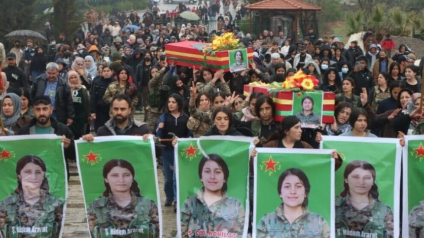 Cenazeyên şervanên Yekîneya Parastina Jin (YPJ) Siyajîn (Diyala Koro) û Cûdî Rojhilat (Culyana Sîdo) ên ku 18`ê Çileyê (2026) li Reqayê şehîd bûbûn, îro bi merasîmeke bi heybet li Pakrewangeha Şehîd Dîcle ya li Kobanê hatin veşartin.