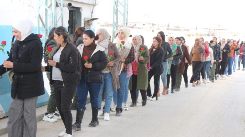 Jinên ji Kongra Star, navenda Hîlala Zêrîn û endamê saziyên Rêveberiya Xweser bi minasebeta 8`ê Adarê Roja Jinên Kedkar ên Cîhanê, bi Dahol û Defê, bi cil bergên xwe yên Kurdî, serdana bendên Kontrolê yên Hêzên Ewlekariya Hundirîn ên bajarê Kobanê kirin û gul li wan belav kirin.
