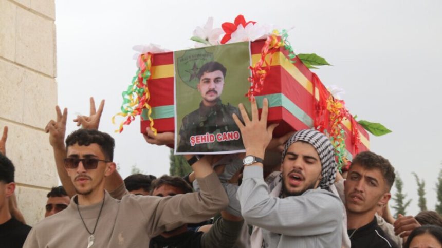 Bi sedan şêniyên bajarê Amûdê û gundewarên wê îro ji bo beşdarbûna merasîma veşartina cenazeyê şervanê hêzên QSD’ê Xidir Murad (Cano Amûdê) ku di 8’ê Çileyê de di berxwedana bendava Tişrînê de şehîd bibû, ber bi goristana şehîd Îsmaîl Hawkar ve herikîn.