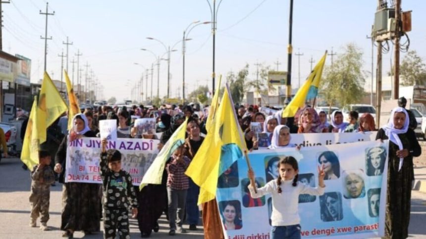 Îro di saetên piştî nîvro de jinên Êzidî û Ereb yên Şengalê bi boneya 25’ê Mijdarê roja ‘Têkoşîna bi tundiya li ser jinê re’ bi pêşengiya TAJÊ û Însiyatîfa Jinên Ereb meşek hate lidarxistin.