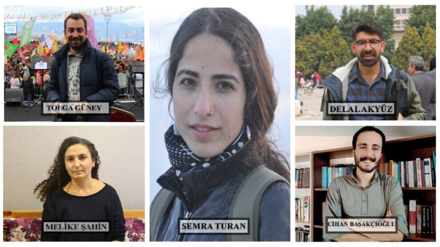 Nûçegihanên Ajansa Mezopotamya (MA) Semra Tûran, Delal Akyuz û Tolga Guney, nûçegihana JINNEWS’ê Melîke Aydin, nûçegihanê Gazete Dûvarê Cîhan Başakçioglu û xebatkara çapemeniyê ya Partiya Wekhevî û Demokrasiyê ya Gelan (DEM Partî) Fatma Fûnda Akbûlût ku li Îzmîrê di 13’ê Sibatê de di serdegirtina malê de hatibûn binçavkirin, piştî karên li midûriyeta polîsan sewqî dozgeriyê hat kirin.