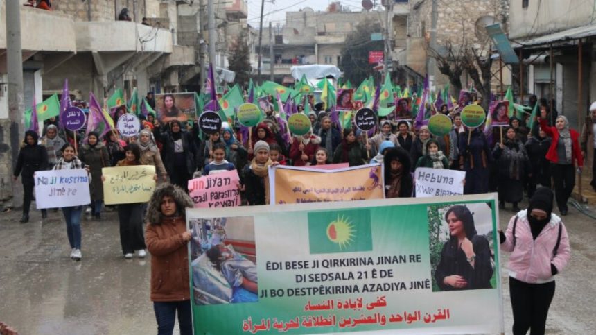 Kongra Star a taxên Şêxmeqsûd û Eşrefiyê yên bajarê Helebê bi dirûşma “Yekitiya jinên Sûriyeyê misogerkirina felsefeya Jin, Jiyan, Azadî ye” meşek li dar xist. Meş li ber hola 8’ê Adarê dest pê kir. Bi sedan jinên li herdu taxan beşdar bûn. Beşdaran pankartên “Jin, Jiyan, Azadî” bilind kirin û berxwedana Yekîneyên Parastina Jin (YPJ) ya li hemberî êrîşên dewleta Tirk a dagirker û çeteyên wê silav kir.