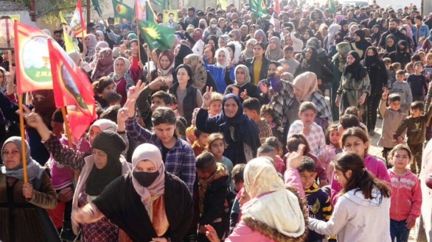 Şêniyan wêneyên şehîdan hildan û dirûşmên “Na ji dagirkeriya Tirk re”, “Na ji kuştina zarok û jinan re”, “Bijî berxwedana QSD’ê” berz kirin.