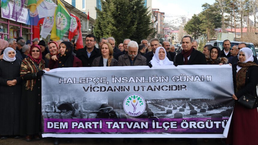 Partiya Herêmên Demokratîk (DBP) û Partiya Wekhevî û Demokrasiyê ya Gelan (DEM Partî) bi boneya salvegera Komkujiya Helebceyê li ber der deriyê avahiya xwe daxuyaniyek dan. Di daxuyaniyê de pankarta “Em Komkujiya Helepce ji bîr nakin” hat vekirin. Parlementera DEM Partiyê ya Sêrtê Sabahat Erdogan Saritaş, namzetên hevşaredariyê yên DEM Partiyê Safiya Alagaş û Mehmet Kaysî, Meclîsa Dayikên Aştiyê, aktivîstên Tergera Jinên Azad (TJA) û hevserokên navend û navçeya navendî yên DBP û DEM Partiyê tev li daxuyaniyê bûn.