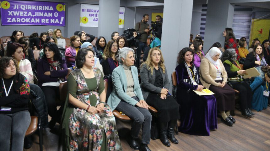 Li eywana konferansê pankartên “Em jinên birêxistin û azad civaka azad ava dikin” û “Li hemberî şerê taybet jin jiyan azadî” hatin daliqandin.