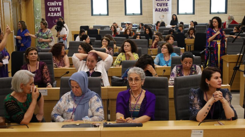 Li salona konferans tê lidarxistin flamayên ku bi zaravayên Kurmancî, Kirmanckî û Soranî ‘Jin jiyan azadî’ hatiye nivîsand, hat daliqandin.