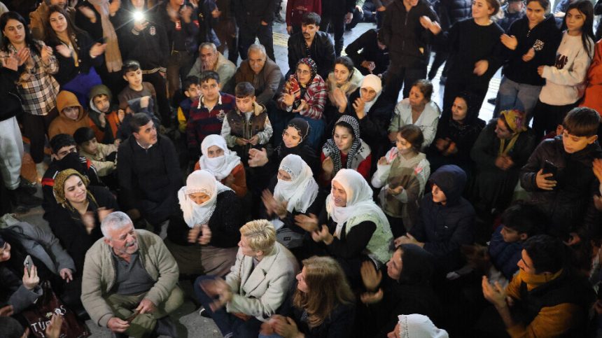 Gel tevî astengiya polîsan jî serdana esnafan kir û banga tevlîbûna li nobeta ku wê sibê li pêşiya şaredariya hatî dorpêçkirî bê lidarxistin, kir. Gel piştî serdana esnafan li pêşiya avahiya DEM Partî ya navçeyê dest bi çalakiya rûniştinê kir. Di çalakiyê de tim û tim dirûşmeyên “Em ê bi berxwedanê bi ser bikevin”, “Akdenîz ya me ye”, “Bijî Berxwedana gelê Kurd”, “Qeyûmê diz, ji Akdenîzê bicihime”, “Bijî Serok Apo”, “Bê Serok jiyan nabe” hatin berzkirin û stranên berxwedanê hatin gotin.