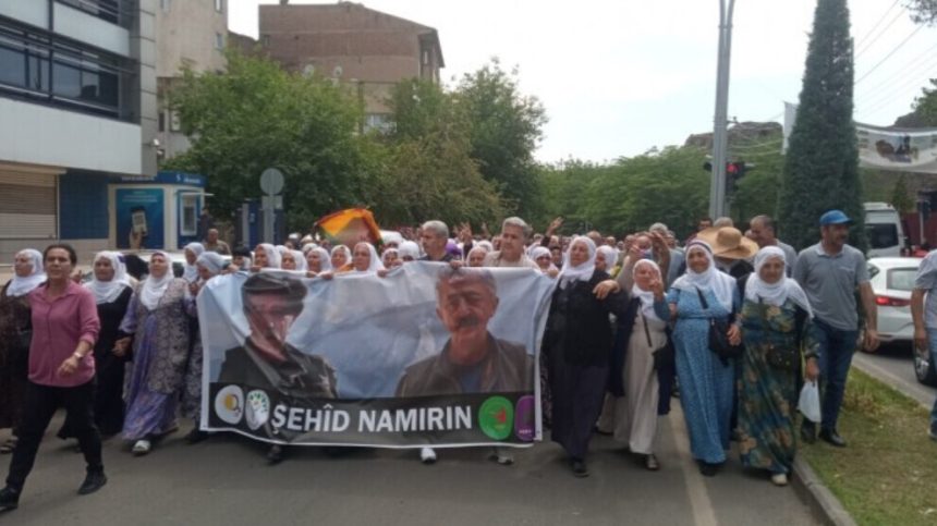 Mirovên ji Mêrdînê hatin, bi dirûşma ‘Şehîd namirin’ tevlî meşê bûn û wêneyên Kaytan û Altûn hildan.