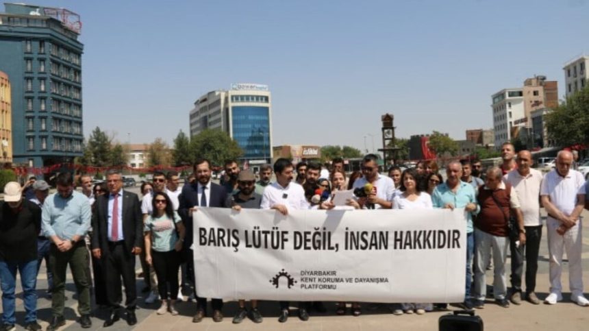 Di daxuyaniyê de ku nûnerên gelek partiyên siyasî û rêxistinên civakî yên sivîl amade bûn, pankarta bin nivîsa “Aştî mafek e, ne qenciyek e” hate hildan.