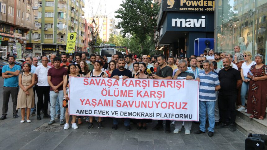 Platforma Ked û Demokrasiyê ya Amedê bi dirûşmeya “Em li dijî şer aştiyê, li dijî mirinê jiyanê diparêzin” li pêşiya AZC Plaza a li taxa Ofîsê daxuyanî da. Gelek kes tevlî daxuyaniyê bû û dirûşmeya “Ji şer re na, a niha aştî” hate berzkirin.