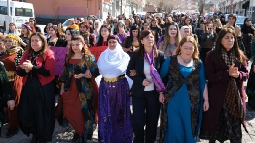 Jin bi dirûşma “Em bi berxwedanê azad dibin, civaka demokratîk ava dikin” li ber avaniya navçeyê ya DBP’ê li hev kom bûn û heta Parka Nûjiyan meşiyan.